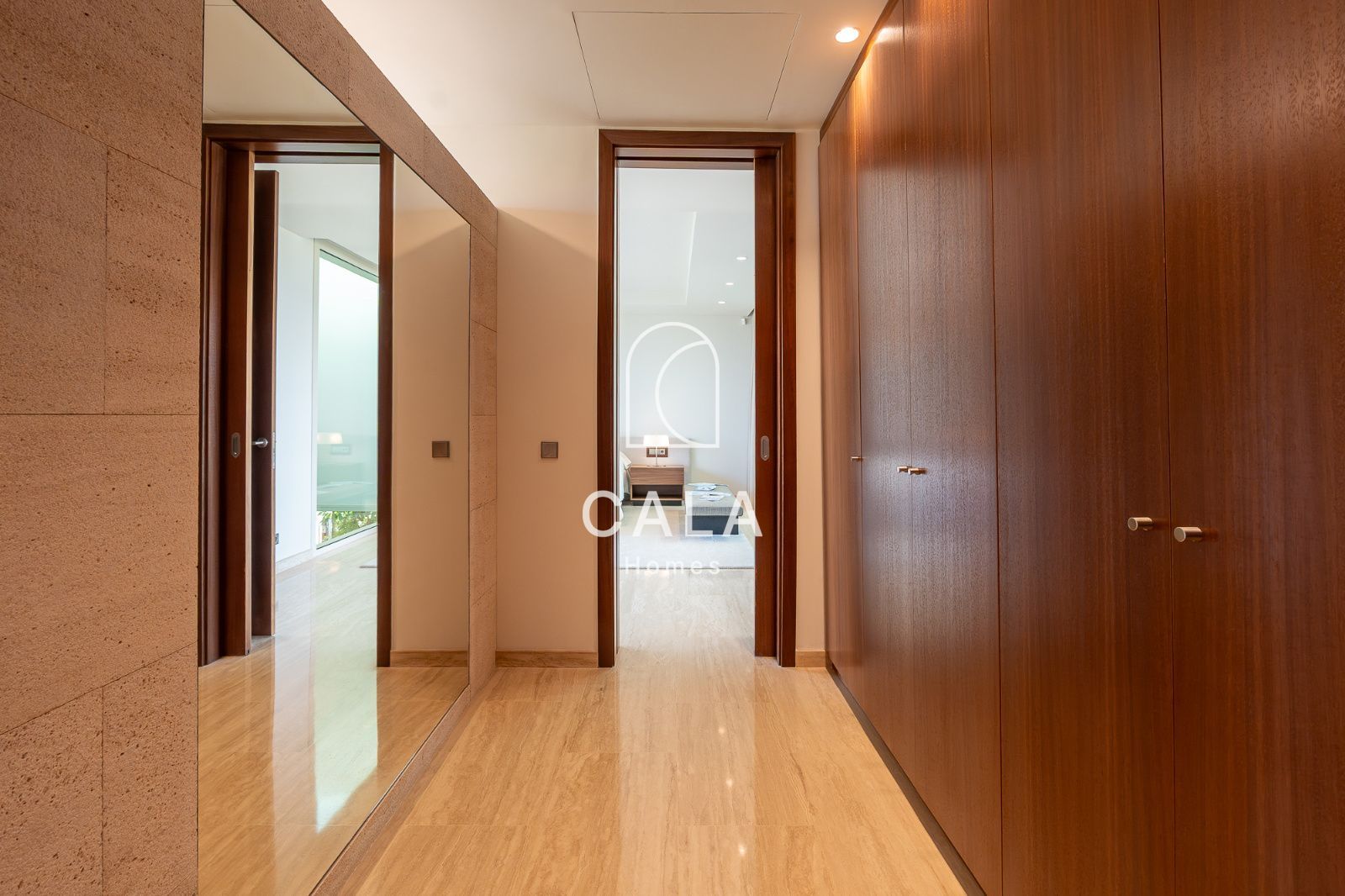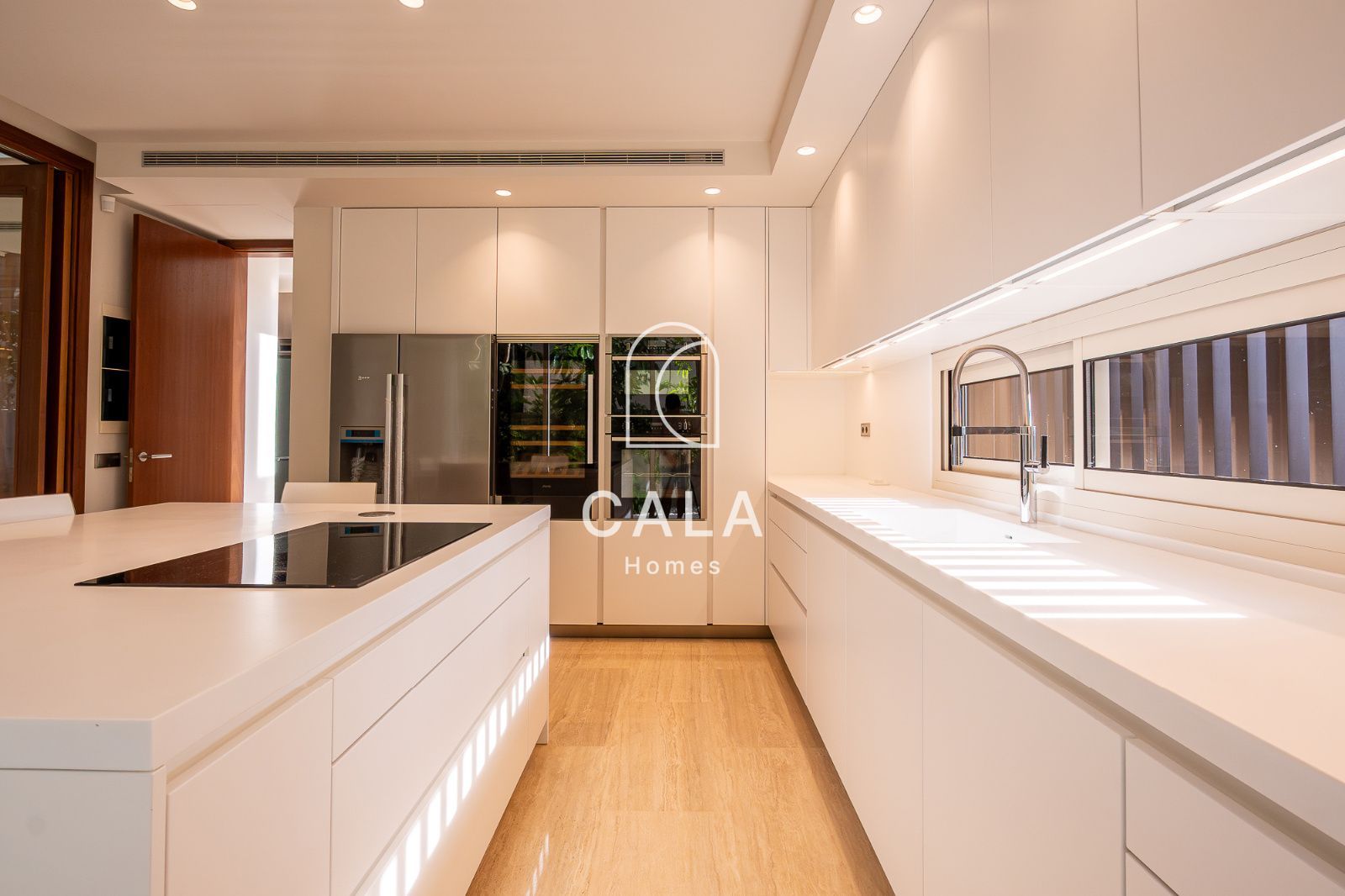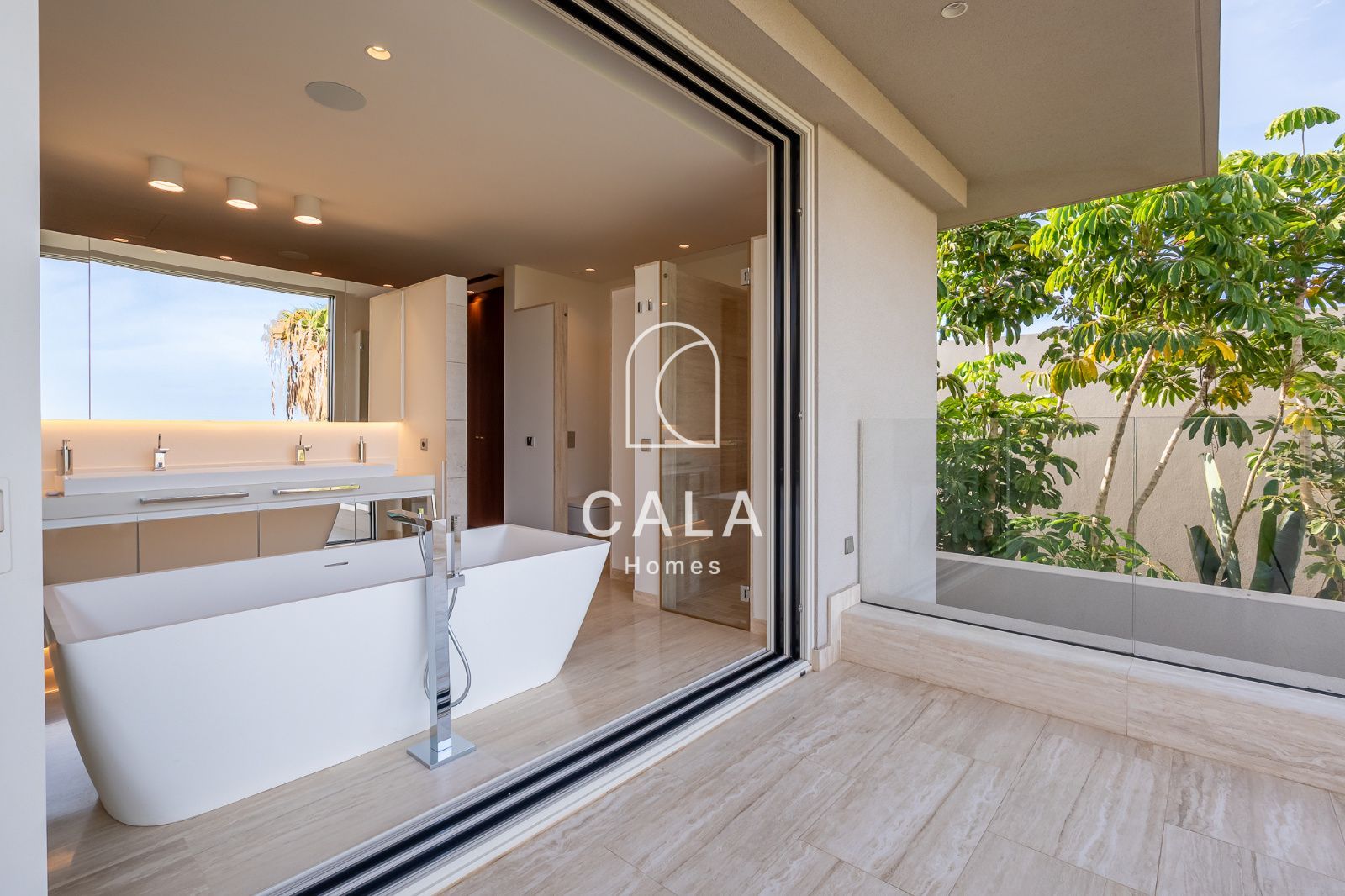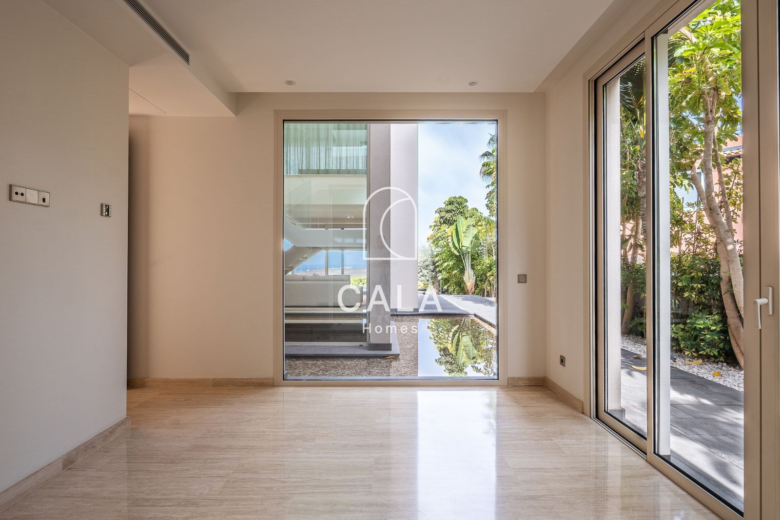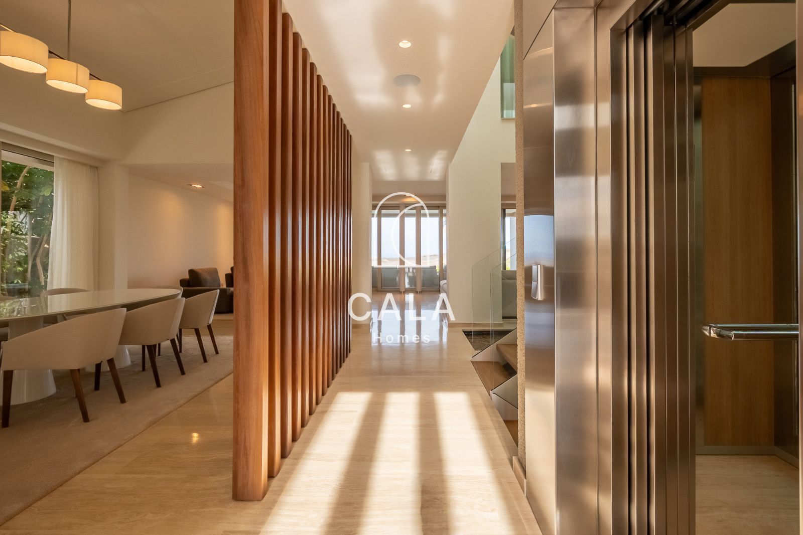 Вилла распределена на три этажа, соединённые лифтом, и окружена элегантным садом с пальмами и тропической растительностью, создающими атмосферу уединения и покоя. Главный этаж впечатляет просторными открытыми помещениями, высокими потолками и большими панорамными окнами, которые наполняют гостиную и столовую естественным светом и гармонично объединяют внутреннее и внешнее пространство. Гурмэ-кухня, оснащённая бытовой техникой NEFF премиум-класса и центральным островом, обращена к морю и является настоящим сердцем дома. С этого уровня открывается выход на главную террасу с зоной отдыха, садом и великолепным инфинити-бассейном с системой встречного течения.