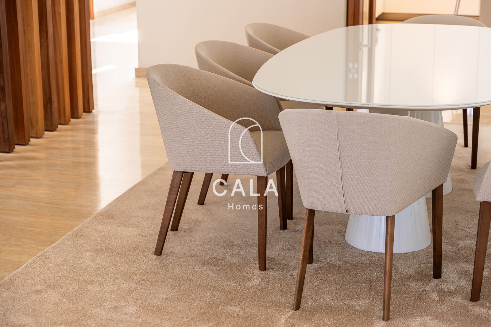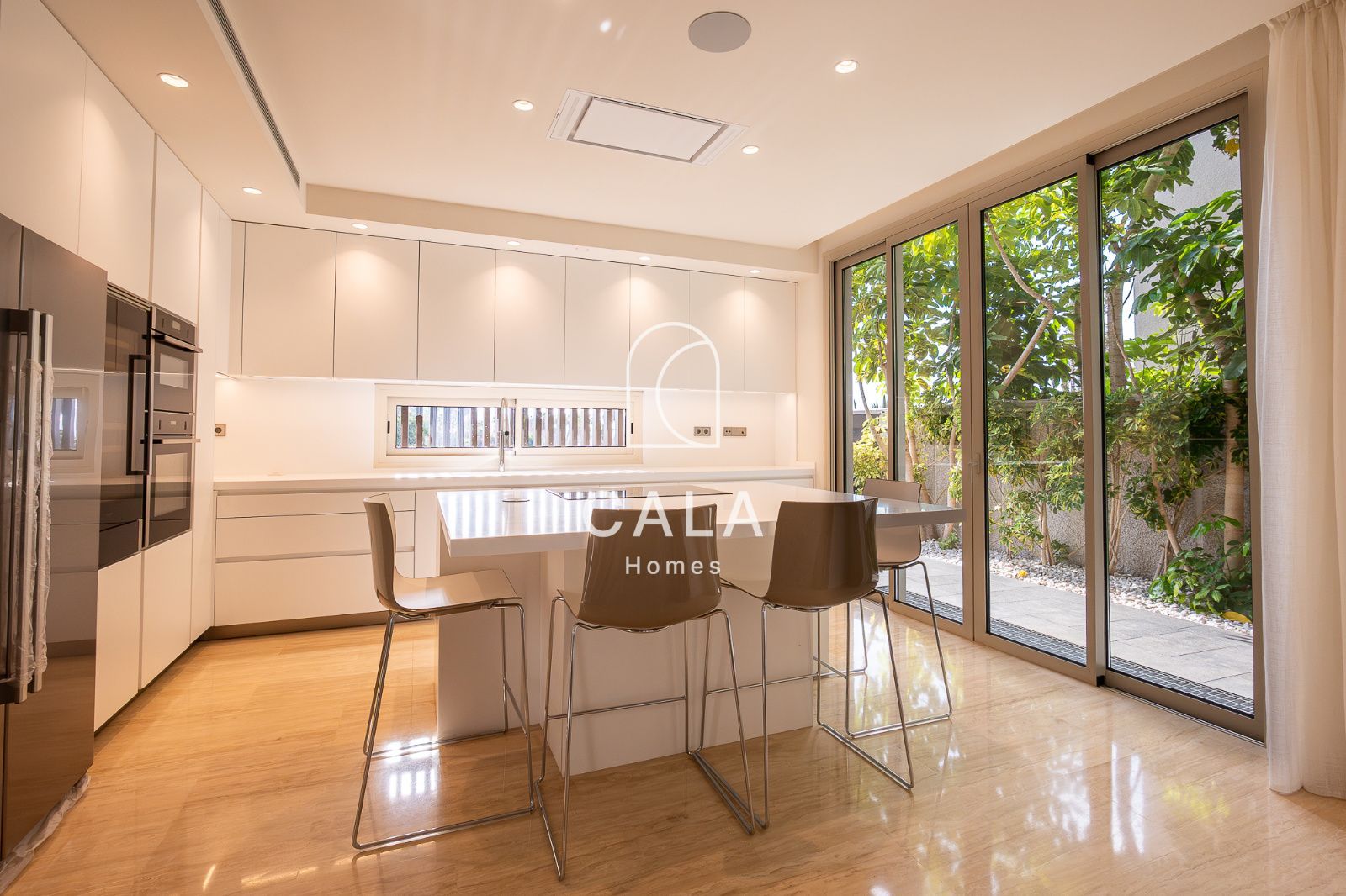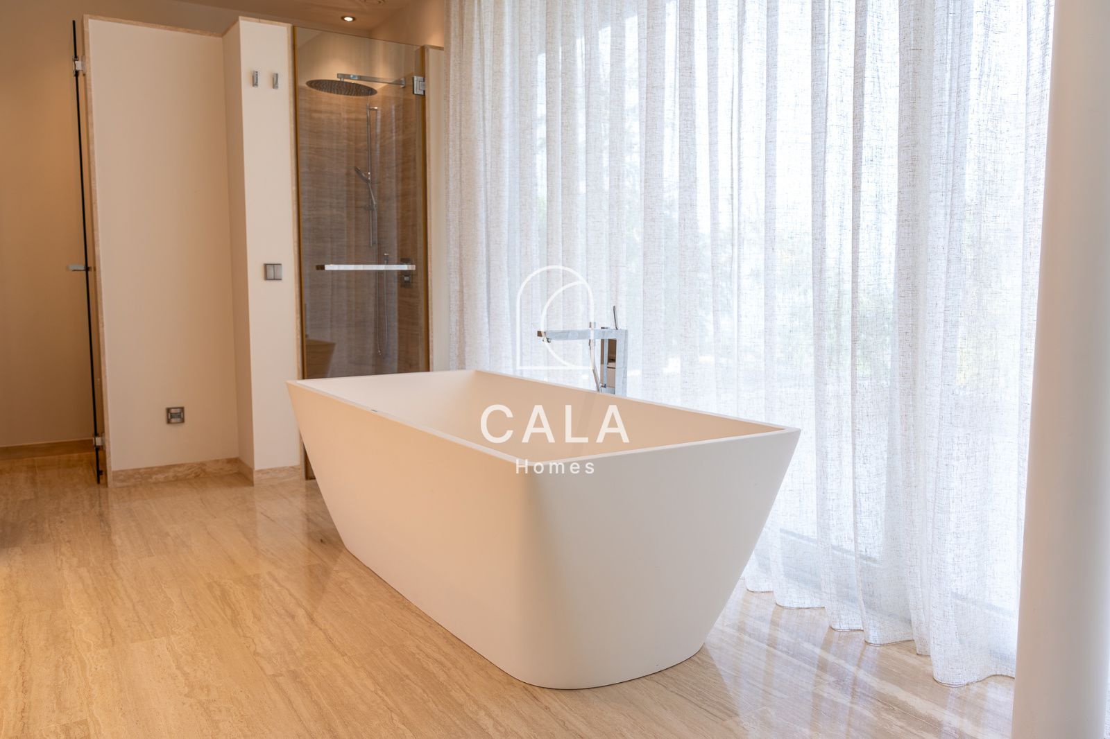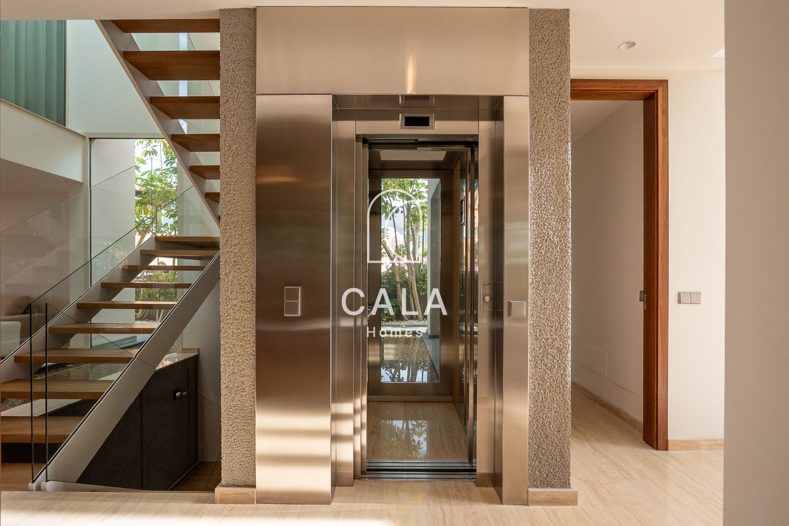 Вилла распределена на три этажа, соединённые лифтом, и окружена элегантным садом с пальмами и тропической растительностью, создающими атмосферу уединения и покоя. Главный этаж впечатляет просторными открытыми помещениями, высокими потолками и большими панорамными окнами, которые наполняют гостиную и столовую естественным светом и гармонично объединяют внутреннее и внешнее пространство. Гурмэ-кухня, оснащённая бытовой техникой NEFF премиум-класса и центральным островом, обращена к морю и является настоящим сердцем дома. С этого уровня открывается выход на главную террасу с зоной отдыха, садом и великолепным инфинити-бассейном с системой встречного течения.