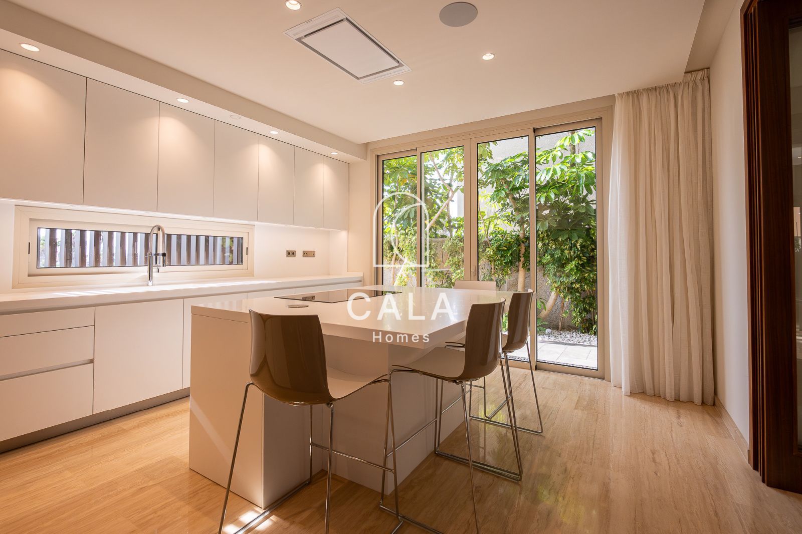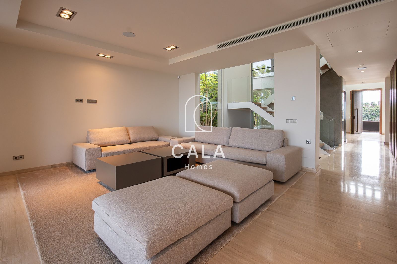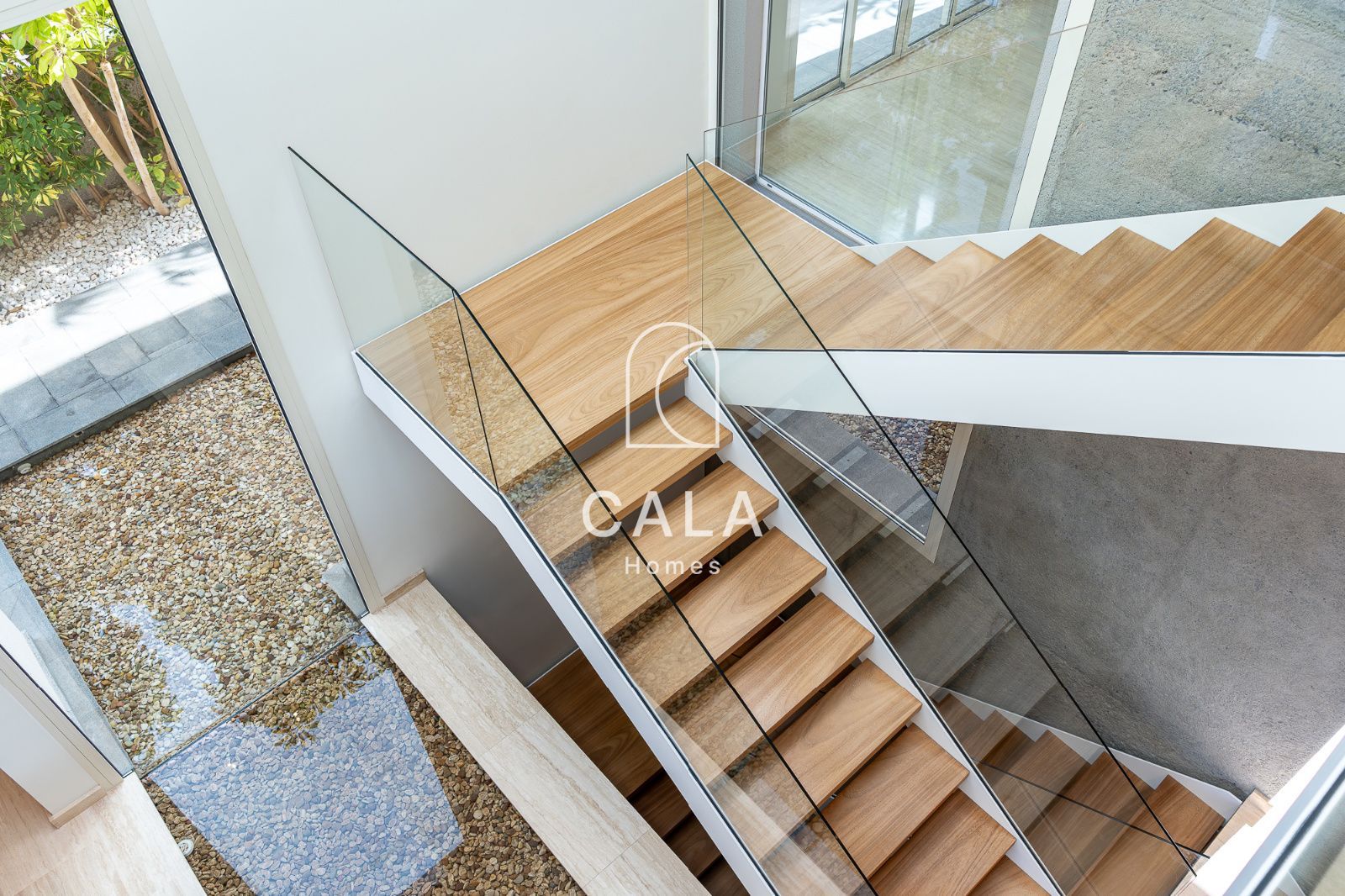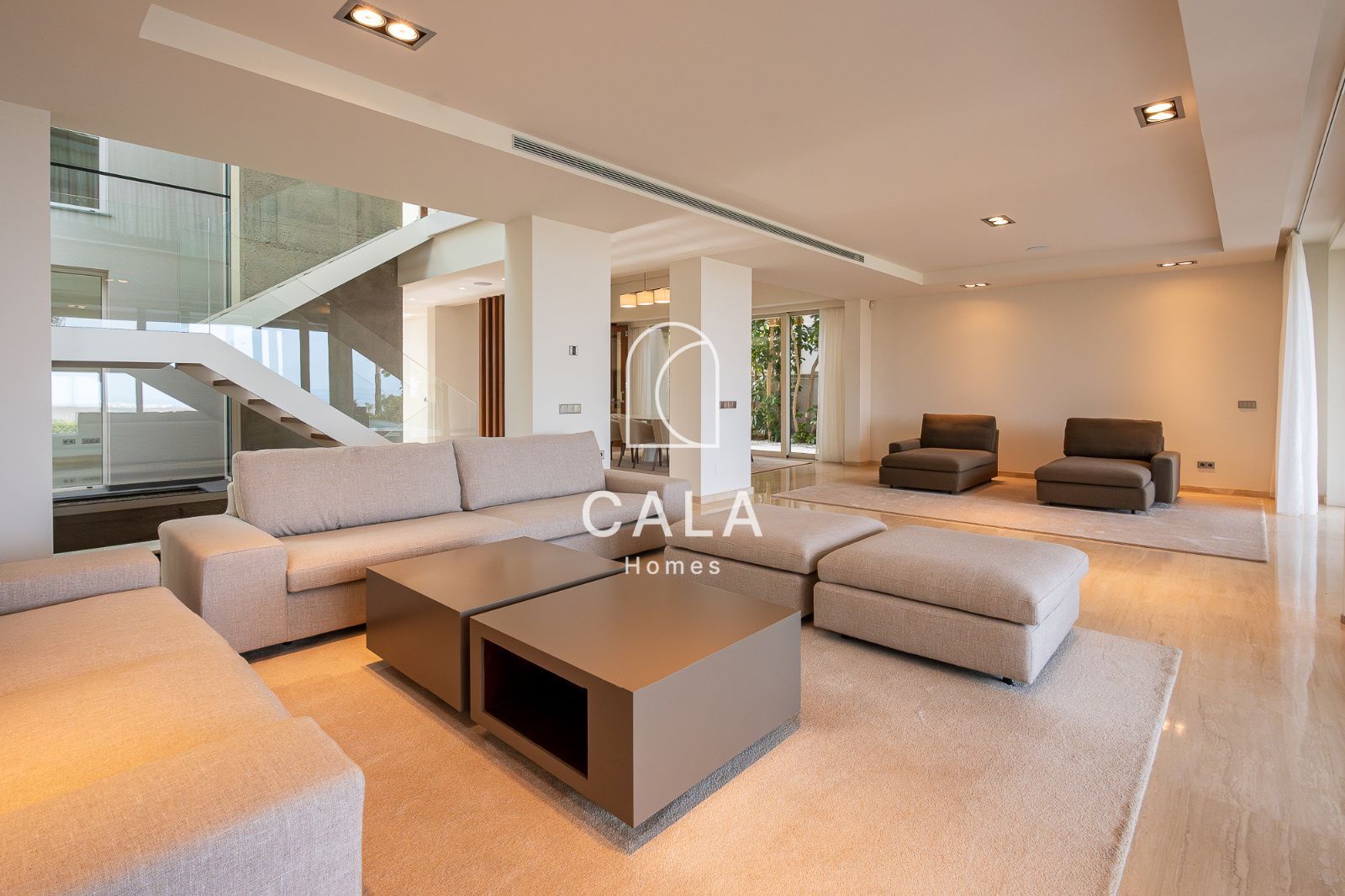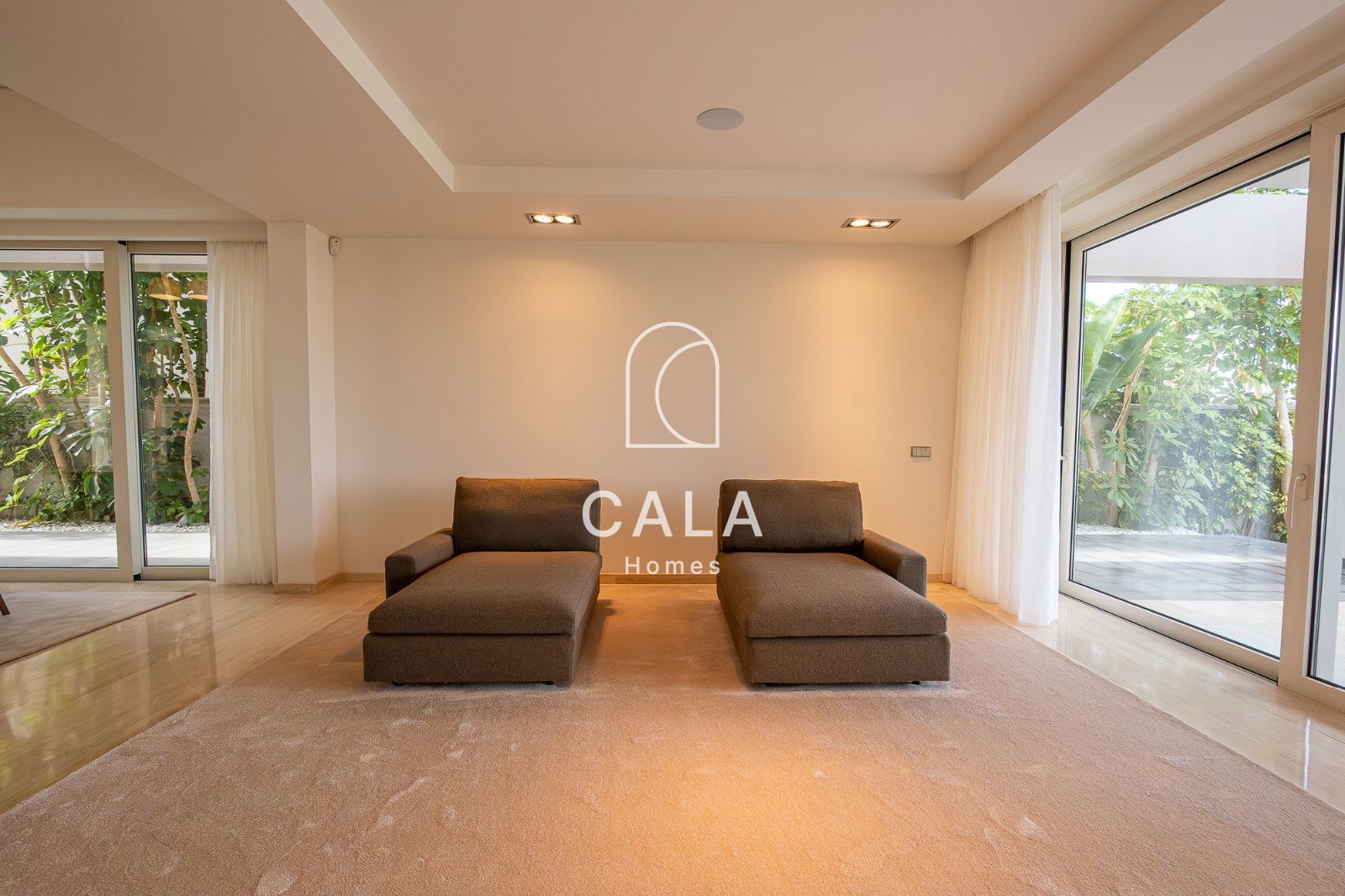 Вилла распределена на три этажа, соединённые лифтом, и окружена элегантным садом с пальмами и тропической растительностью, создающими атмосферу уединения и покоя. Главный этаж впечатляет просторными открытыми помещениями, высокими потолками и большими панорамными окнами, которые наполняют гостиную и столовую естественным светом и гармонично объединяют внутреннее и внешнее пространство. Гурмэ-кухня, оснащённая бытовой техникой NEFF премиум-класса и центральным островом, обращена к морю и является настоящим сердцем дома. С этого уровня открывается выход на главную террасу с зоной отдыха, садом и великолепным инфинити-бассейном с системой встречного течения.