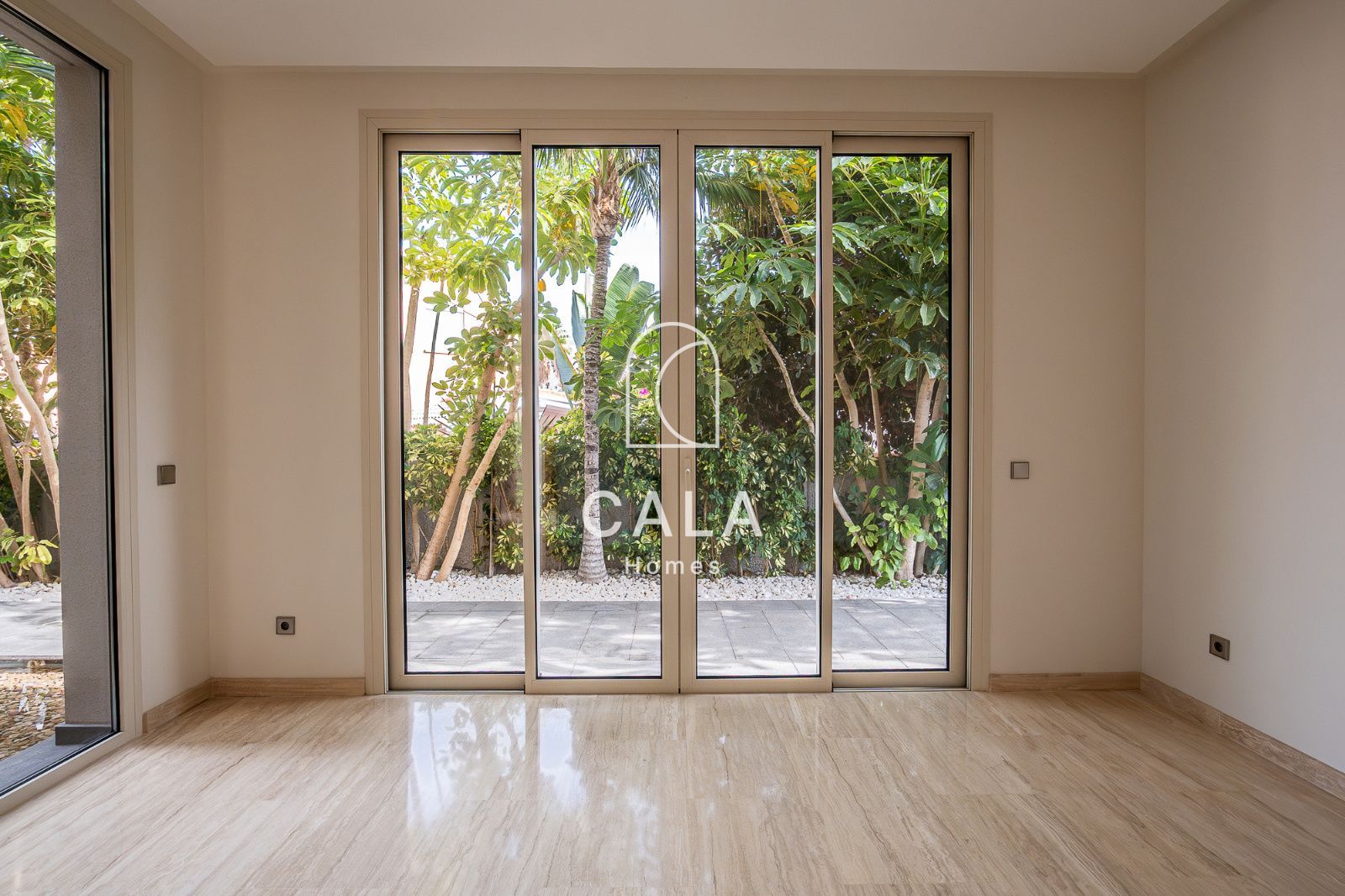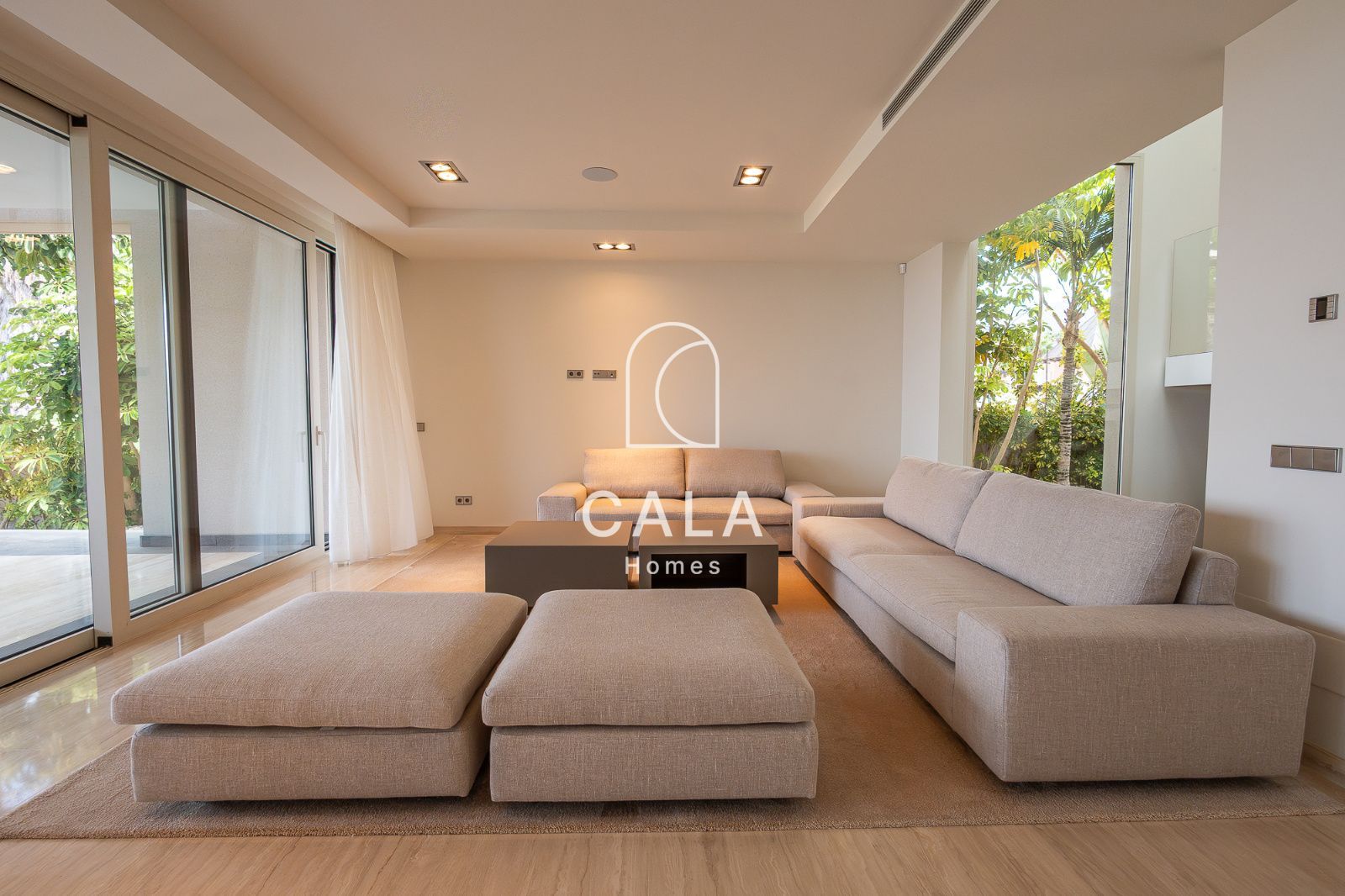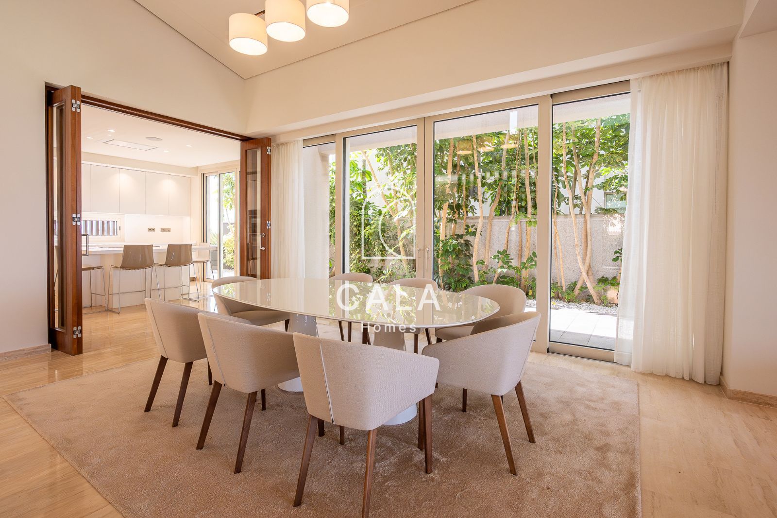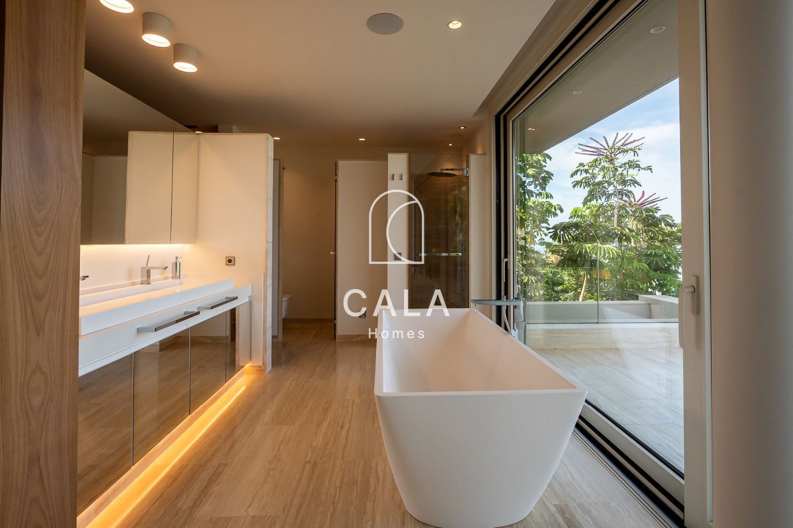 Вилла распределена на три этажа, соединённые лифтом, и окружена элегантным садом с пальмами и тропической растительностью, создающими атмосферу уединения и покоя. Главный этаж впечатляет просторными открытыми помещениями, высокими потолками и большими панорамными окнами, которые наполняют гостиную и столовую естественным светом и гармонично объединяют внутреннее и внешнее пространство. Гурмэ-кухня, оснащённая бытовой техникой NEFF премиум-класса и центральным островом, обращена к морю и является настоящим сердцем дома. С этого уровня открывается выход на главную террасу с зоной отдыха, садом и великолепным инфинити-бассейном с системой встречного течения.